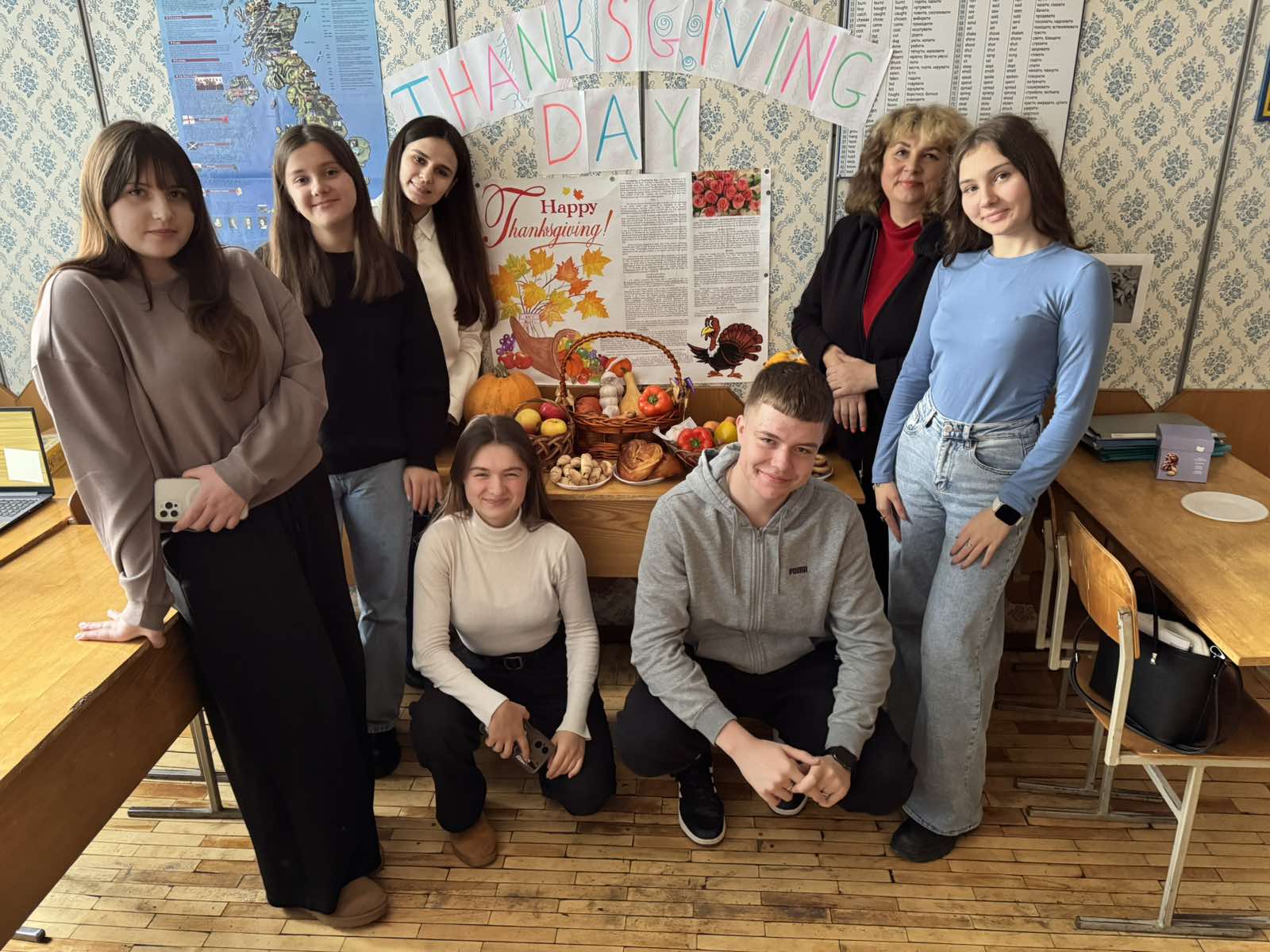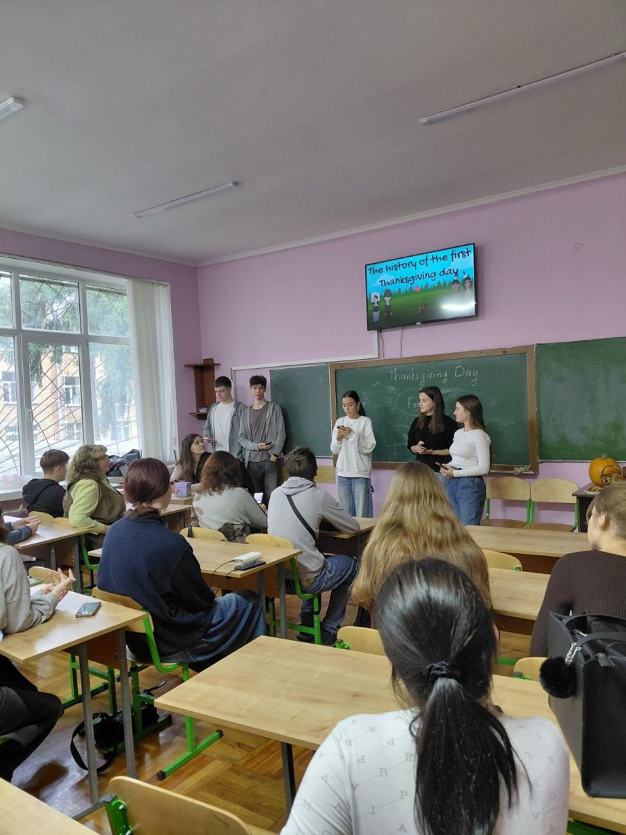 This year's Thanksgiving Day on November 27 was celebrated by the third- and first-year students. A group of 3F with Olena Mozharovska prepared interesting information and competitions for the first courses. Students of groups 1KІ3 and 1M participated in the cognitive and dance battles. Students guessed the words associated with traditional dishes that are prepared for this holiday, demonstrated their awareness of answering questions about Thanksgiving. They thanked in English for all the good things in life, participated in Quiz Time -Thanksgiving Trivia, the verbal relay of Thanksgiving Word Race to test their knowledge of the thematic vocabulary.