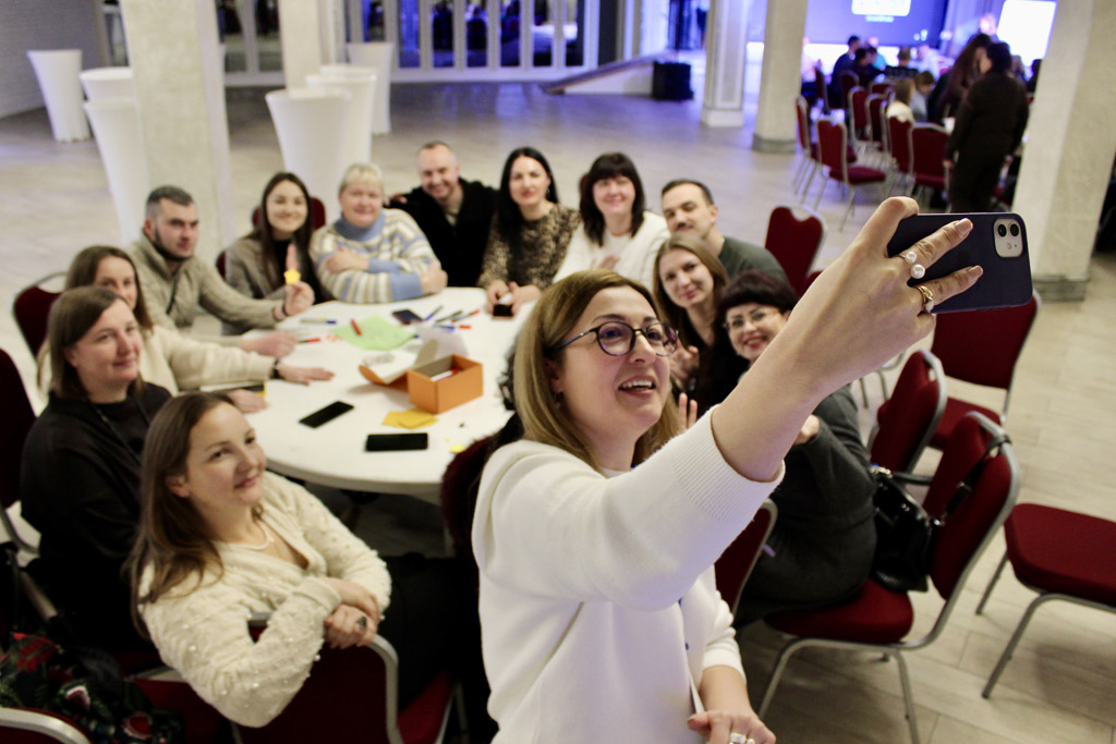 А далі – від теорії до практики. За пʼятьма столами Світового кафе наші викладачі разом з коучами працювали над реальними ситуаціями і кейсами. За червоним група Галини Бурковськоі, магістра психології, психотерапевта і професійного тренера для педагогів, розбиралась в нюансах психологічної безпеки викладача.