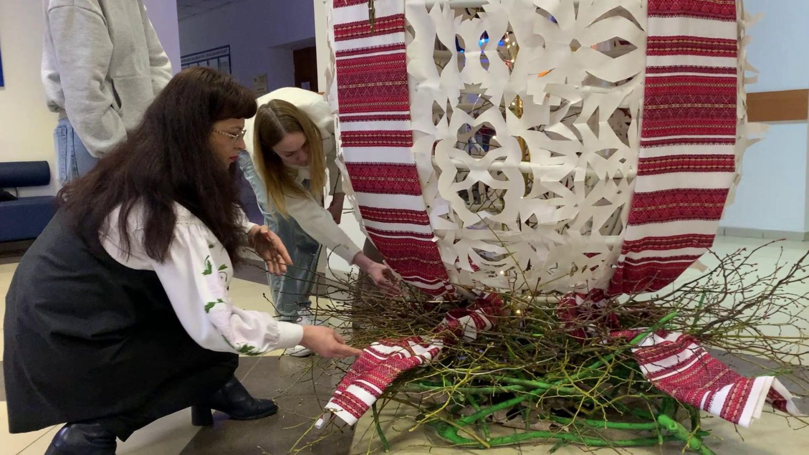 В результаті - в холі коледжу з'явилось двометрове яйце-витинанка! Понад сорок паперових полотен з візерунками виготовили студенти під час майстер класів. Великоднього символізму та української традиційності декору додали вишивані рушники і гілочки верби.