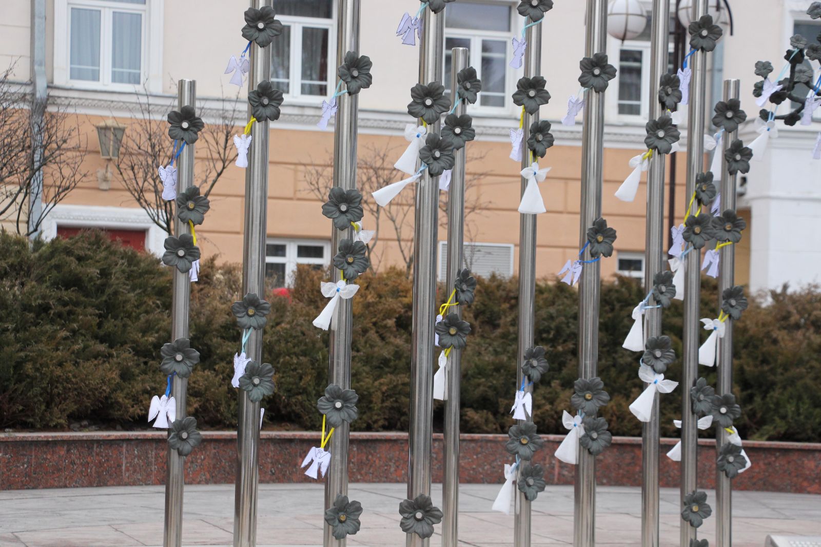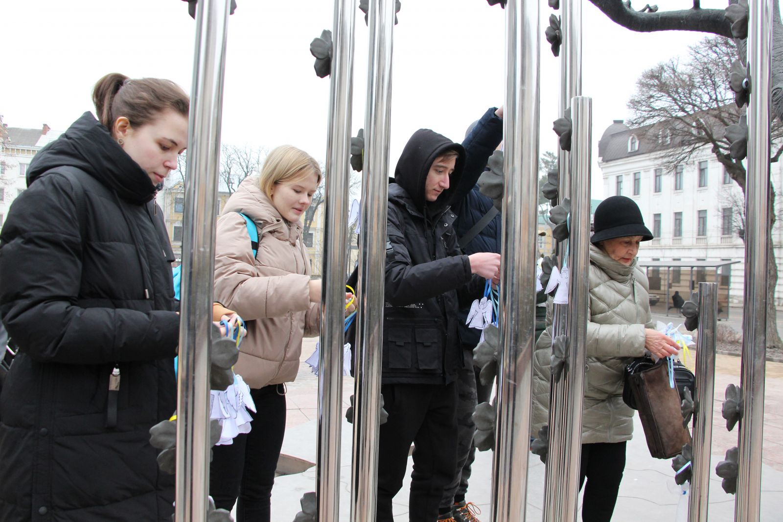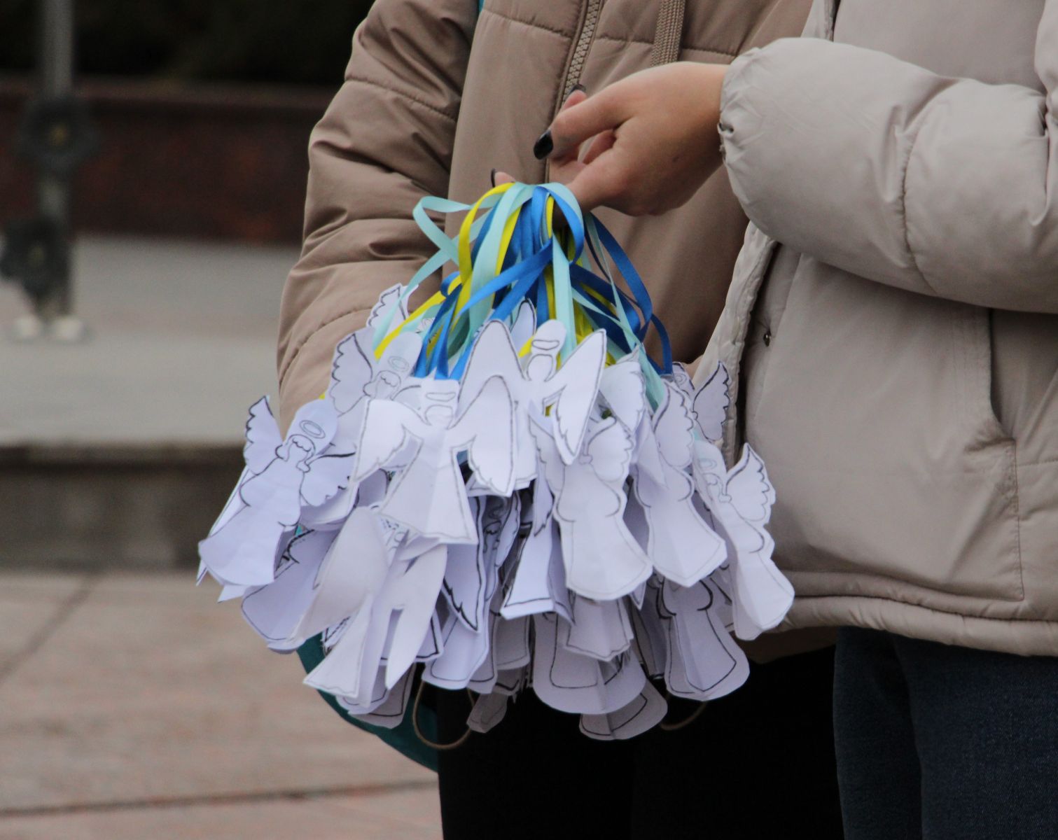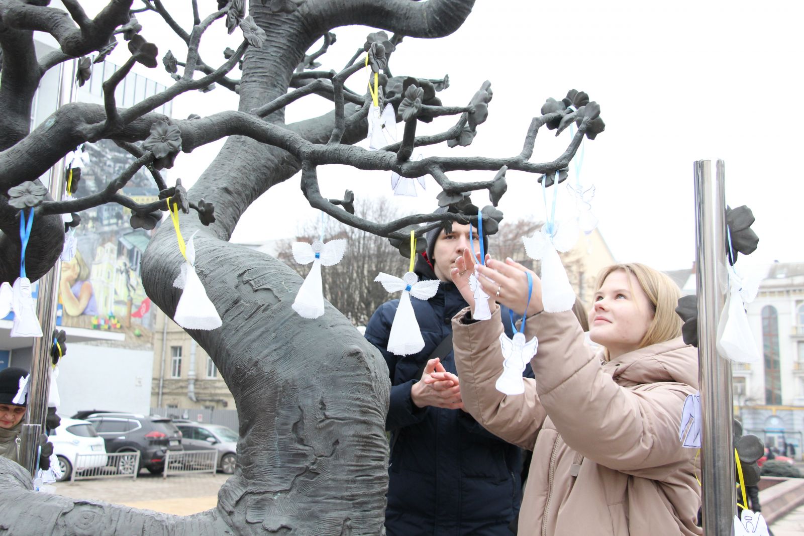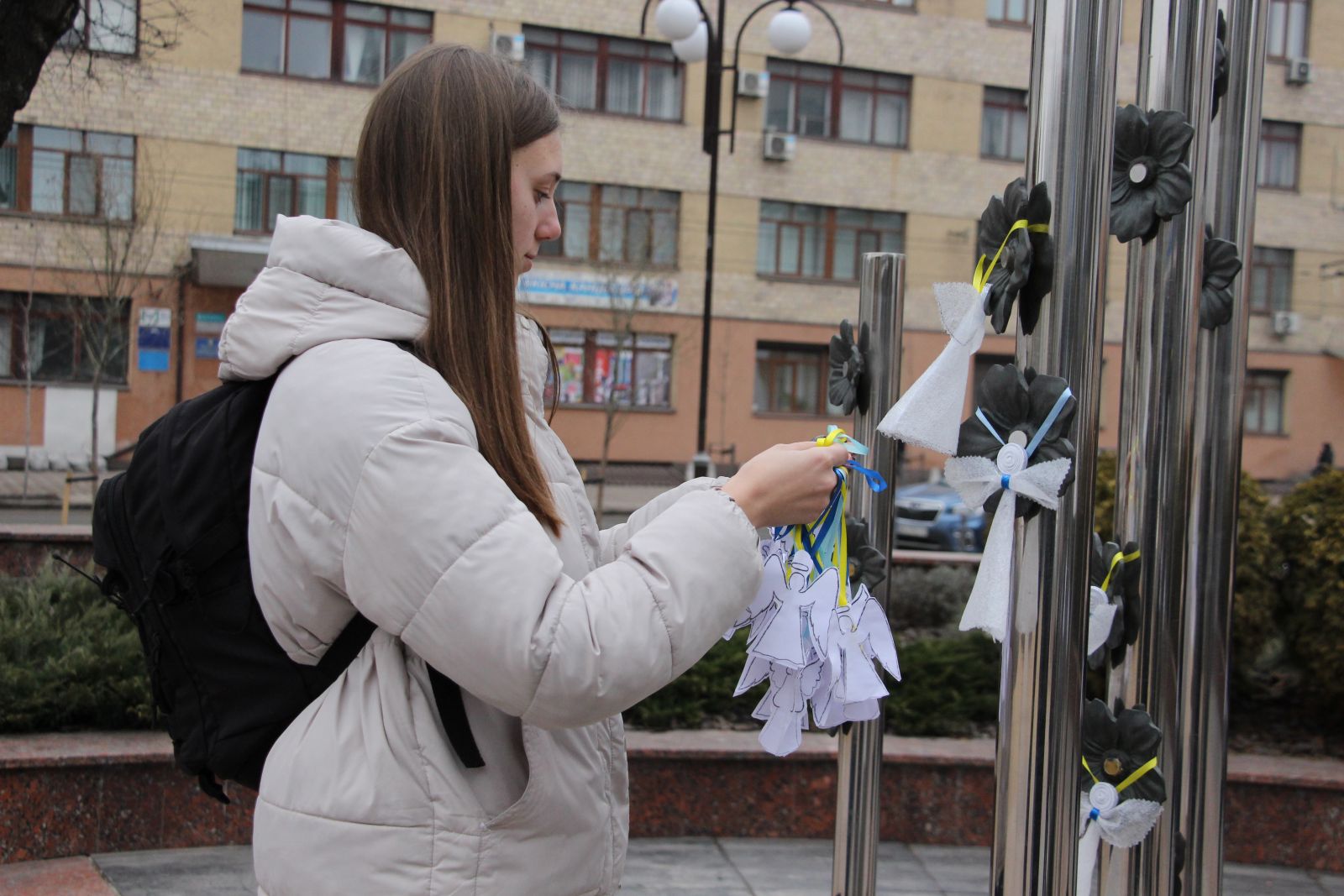 Рідні загиблих і молодь розвісили на меморіалі 107 паперових янголів. Вони символізують душі розстріляних на київському Майдані під час Революції гідності.