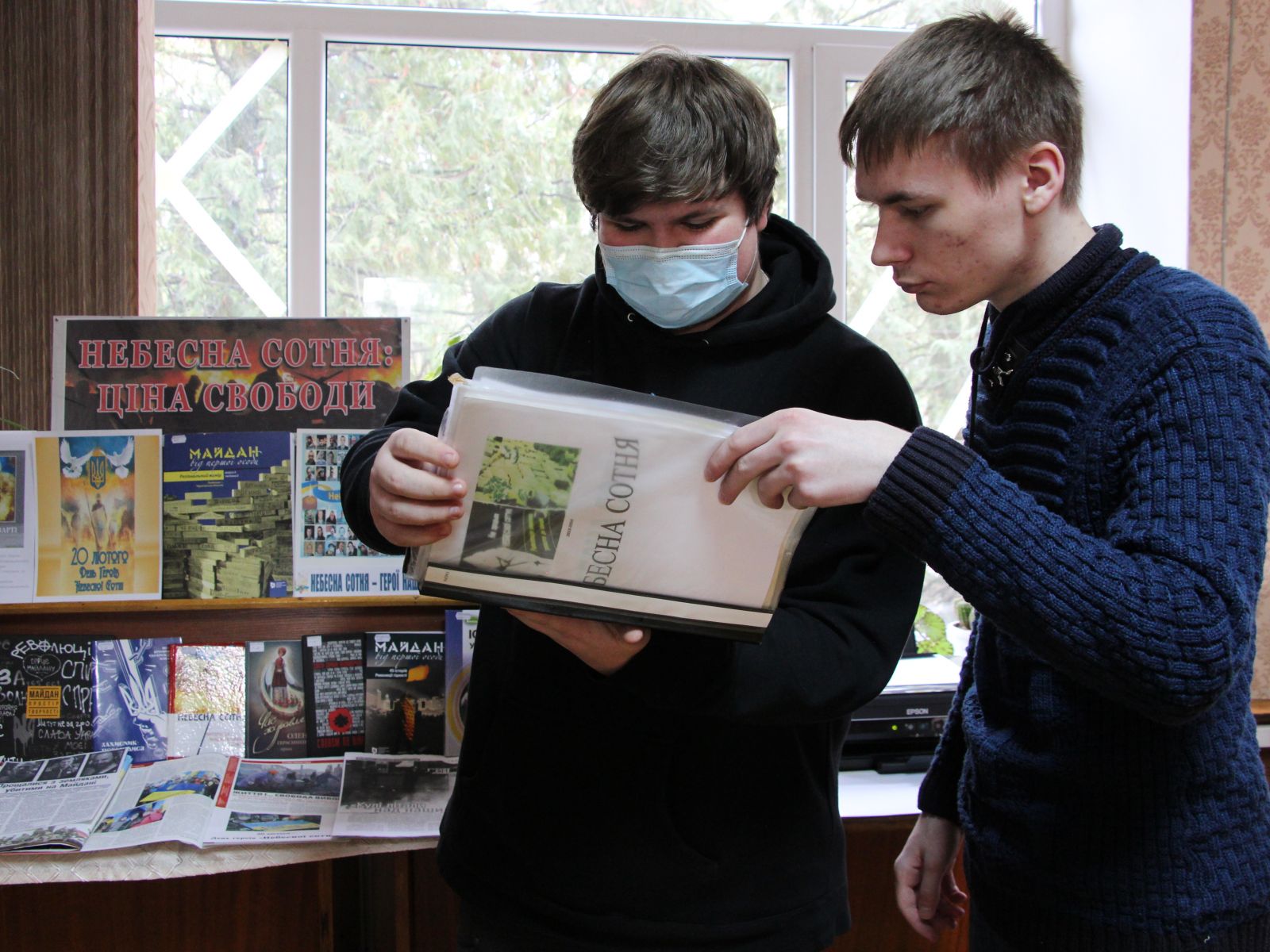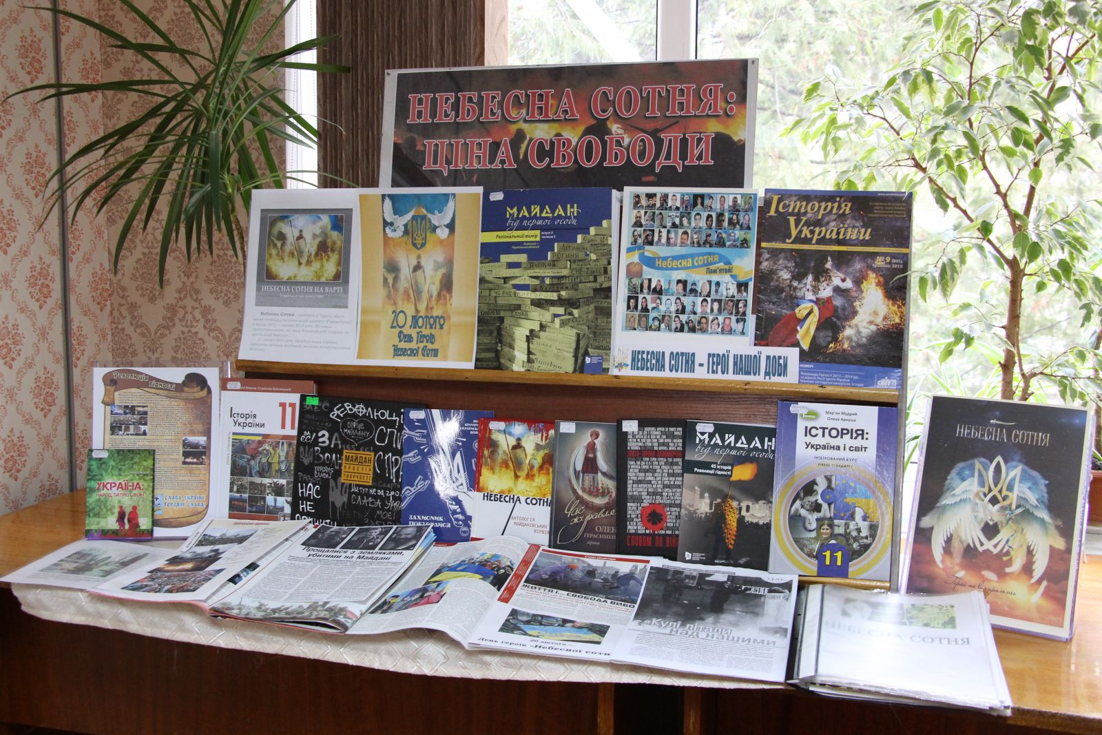 Долучаючись до вшанування пам’яті Героїв Небесної Сотні, працівники бібліотеки пропонують ознайомитися з виставкою-реквієм «Небесна Сотня: ціна свободи». В експозиції представлено документи з фонду бібліотеки документальні, художні книги сучасних українських авторів та світлини з періодичних видань про реальні факти трагічних подій на Майдані у лютому 2014 року, біографії Героїв Небесної Сотні, спогади їхніх родичів, близьких, друзів, побратимів.