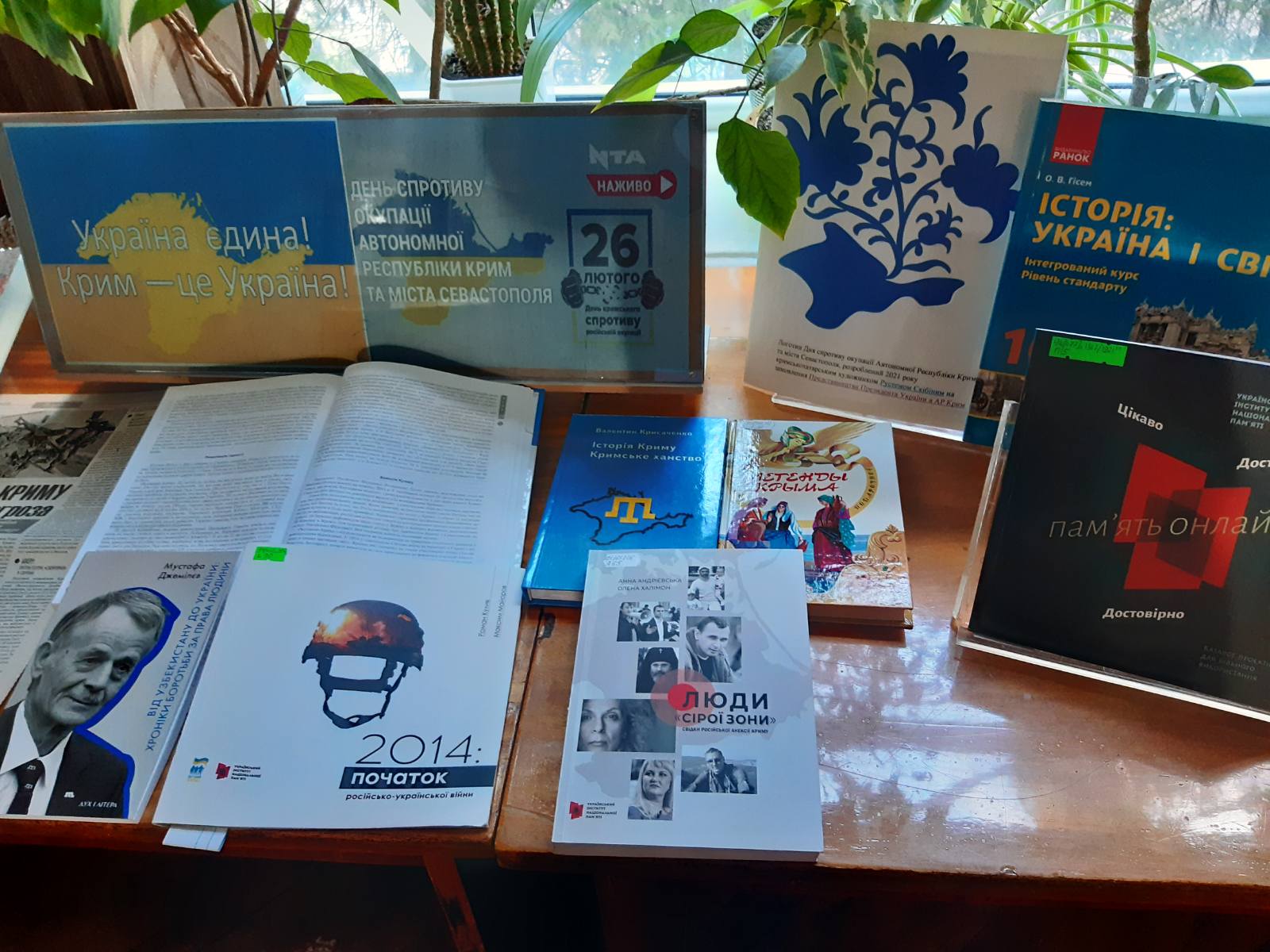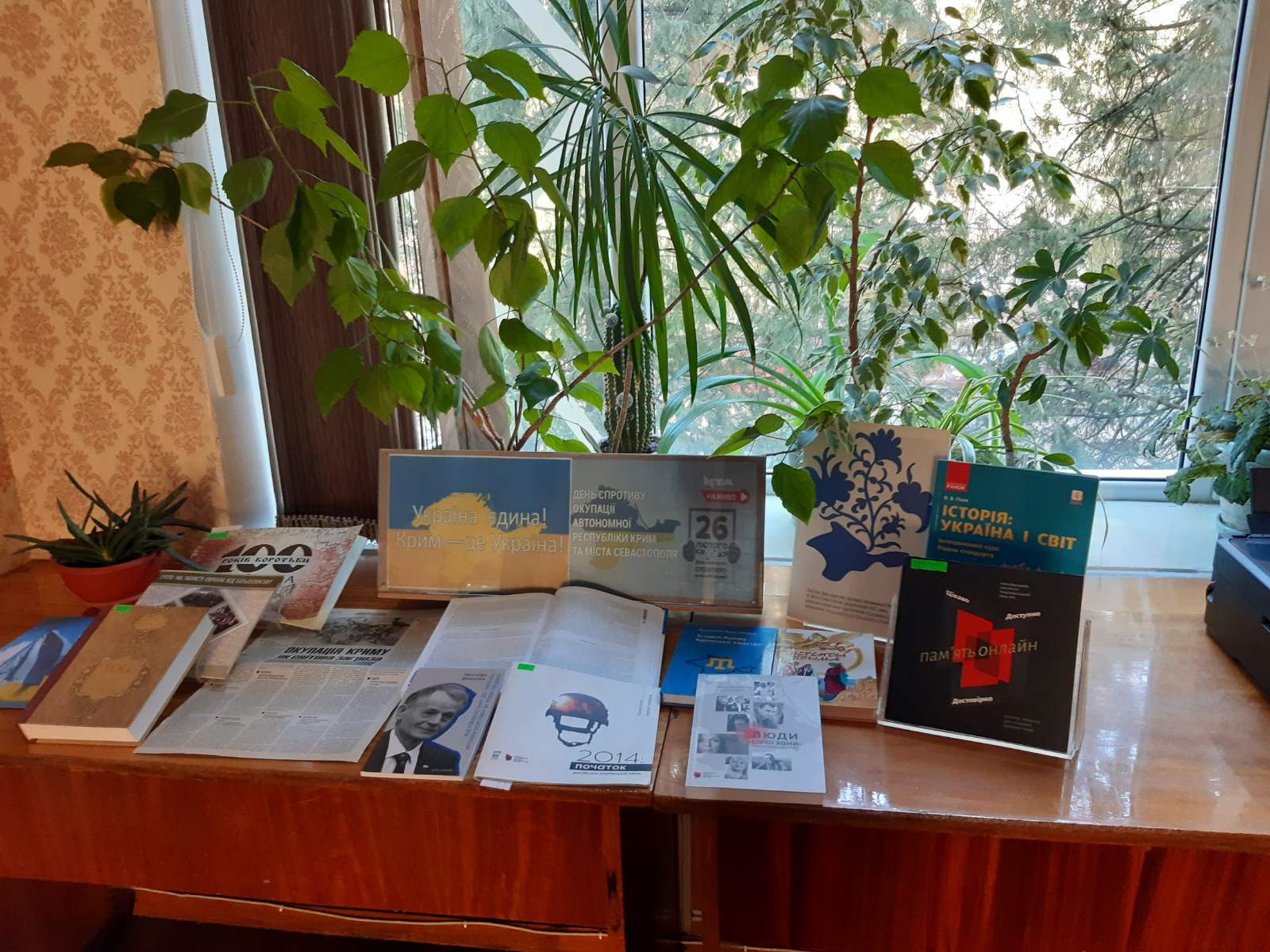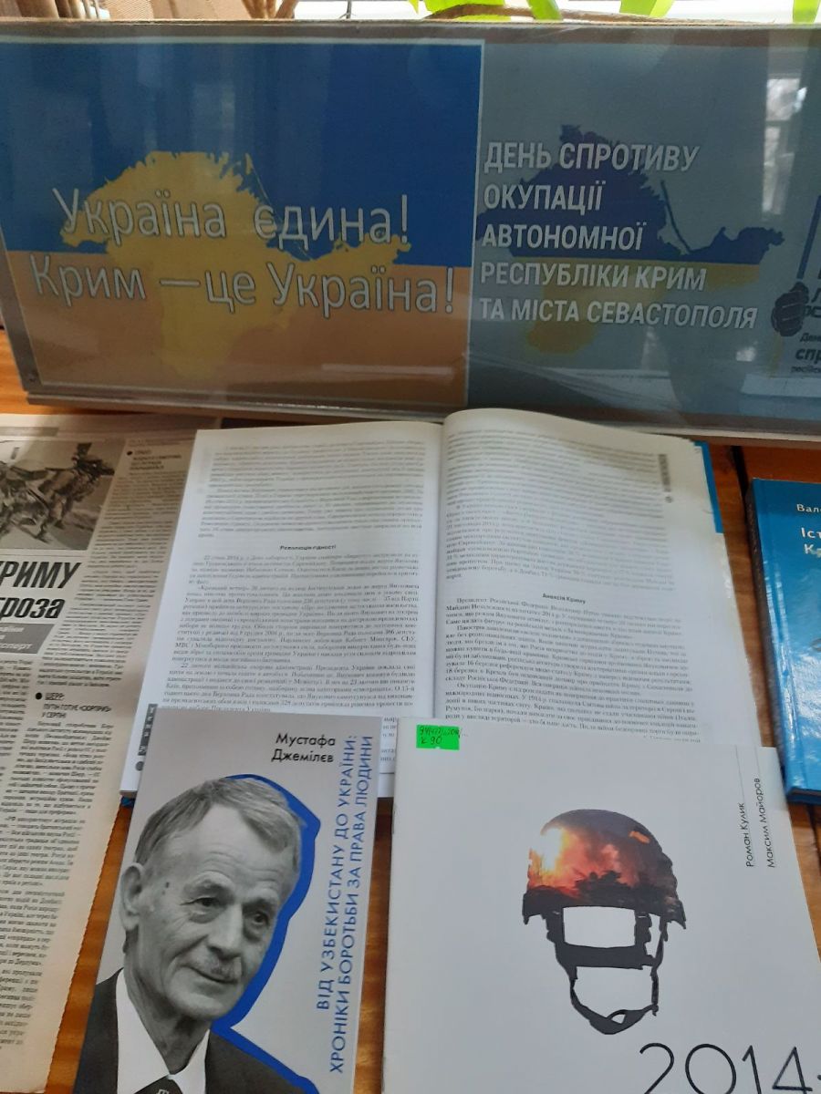 В експозиції зібрані видання що розповідають правду про історію, традиції та звичаї корінного населення Криму, депортацію кримських татар, про події 2014 року. Незважаючи на всі відмінності регіонів, Україна є, була і залишиться єдиною державою!