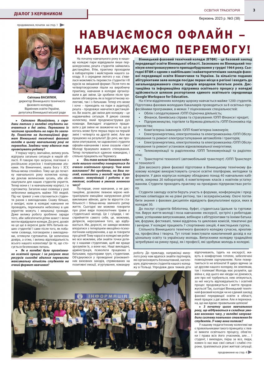 Так директорка нашого коледжу Світлана Василюк відповіла на питання журналіста про організацію освітнього процесу у ВТФК. Про які досягнення і новації коледжу розповіла колегам всієї України – читай у великому інтерв’ю для інформаційного вісника «Освітня траєкторія».