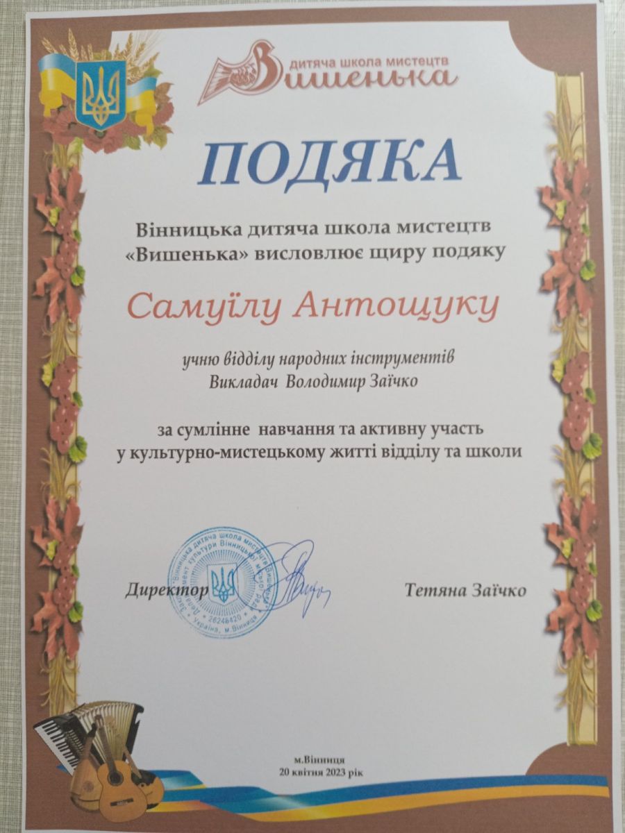 Віртуозній грі на баяні юнак навчається в дитячій школі мистецтв “Вишенька”. До перемоги в старшій віковій категорії престижного регіонального конкурсу Самуїла підготував викладач відділу народних інструментів Володимир Заїчко.