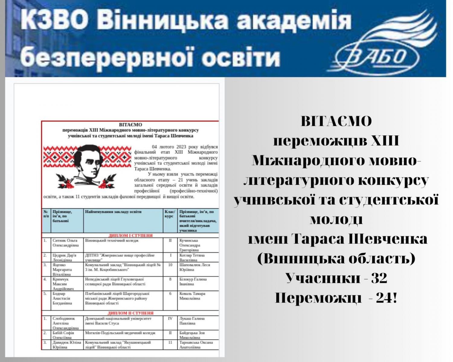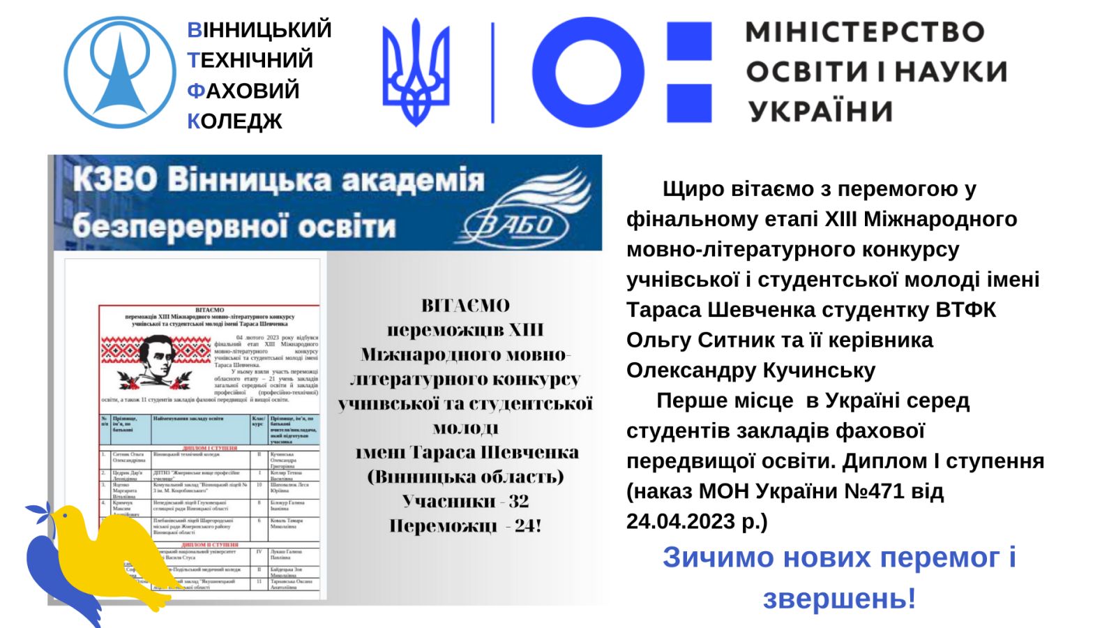 Ольга Ситник, студентка ВТФК, перемогла у фінальному етапі ХІІІ Міжнародного мовно-літературного конкурсу учнівської та студентської молоді імені Тараса Шевченка!