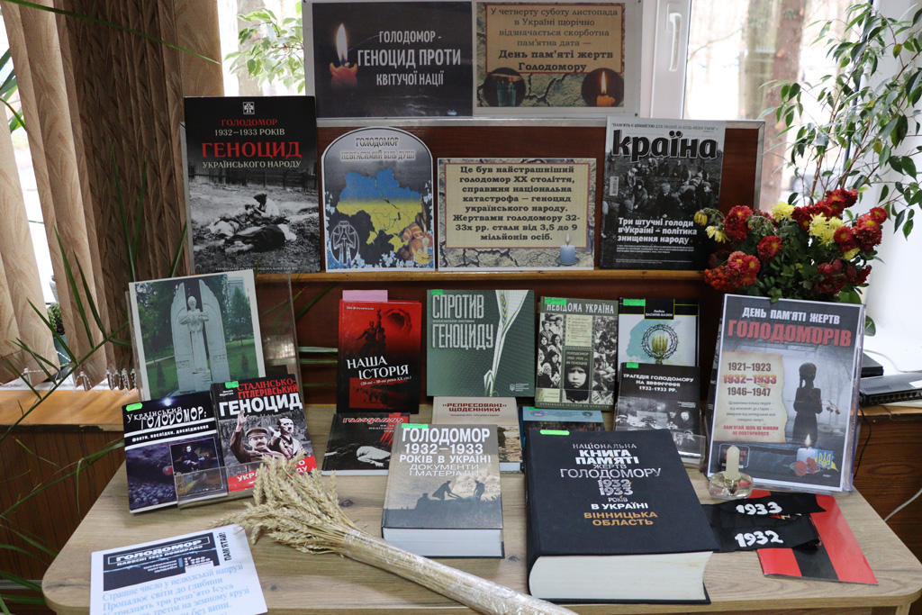 Книжкову виставку-реквієм «Голодомор – геноцид проти квітучої нації» також представили наші бібліотекарі. У кожному виданні підтвердження - тоталітарний режим зробив все , щоб стерти спогади про вбивство понад 7 мільйонів українців. Але ми пам'ятаємо.