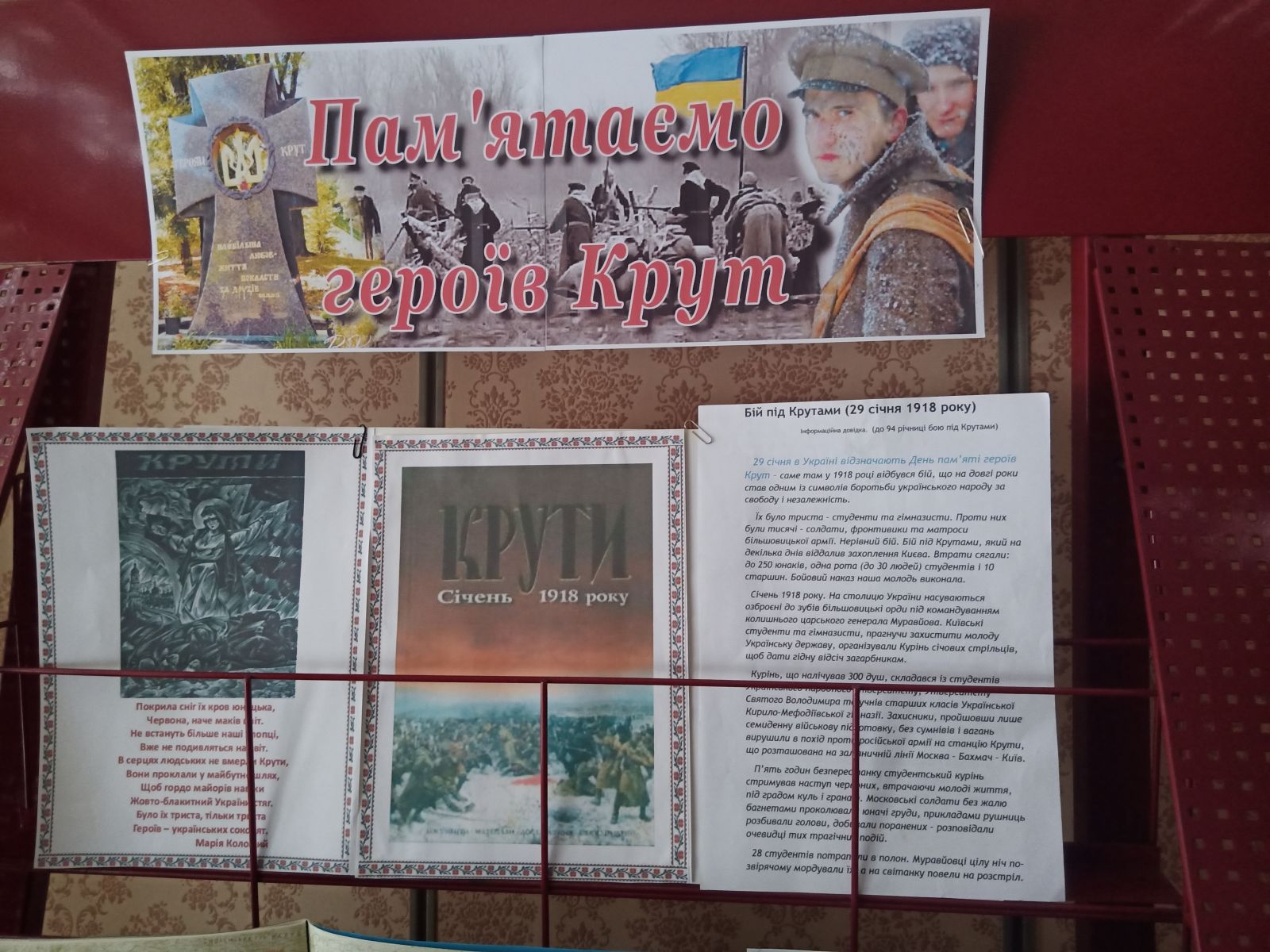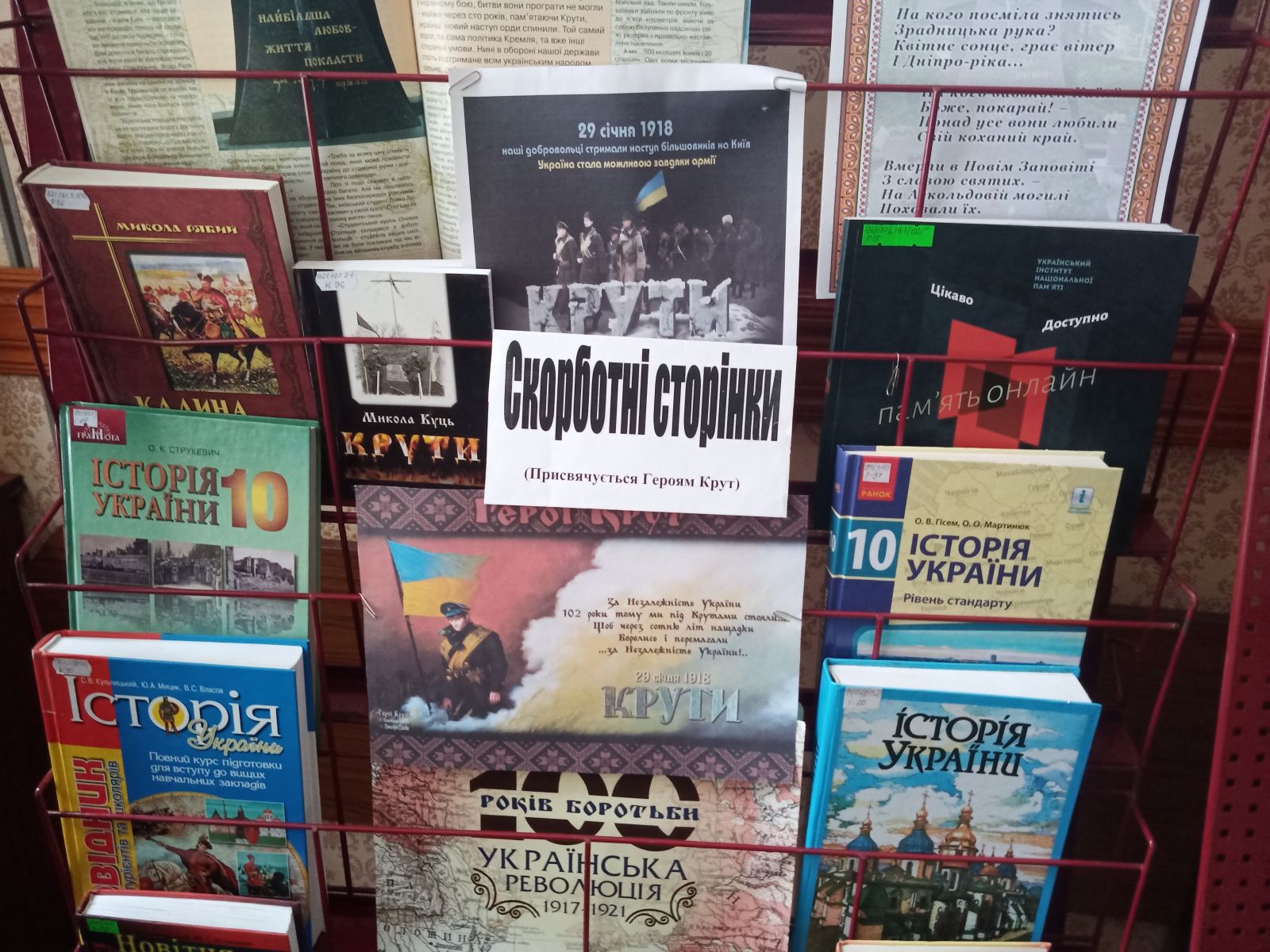 Героїчну і водночас трагічну сторінку історії - бій під Крутами пригадали і в нашому коледжі. У читальній залі бібліотекарі презентували книжкову виставку “Крути-наша слава, наша історія”. На експозиції представили підручники, довідники та фотокартки, присвячені тогочасним подіям.