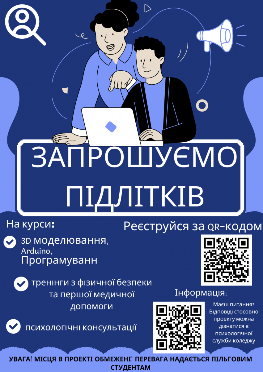 Крім цього, в інноваційно-освітньому хабі нашого коледжу для студентів пройдуть тренінги з фізичної безпеки, першої медичної допомоги, психологічні консультації, а також навчальний табір.