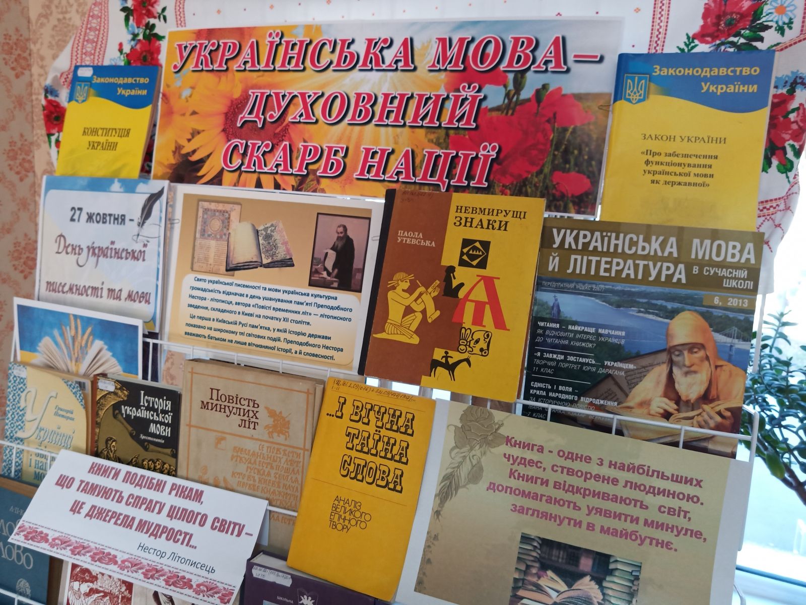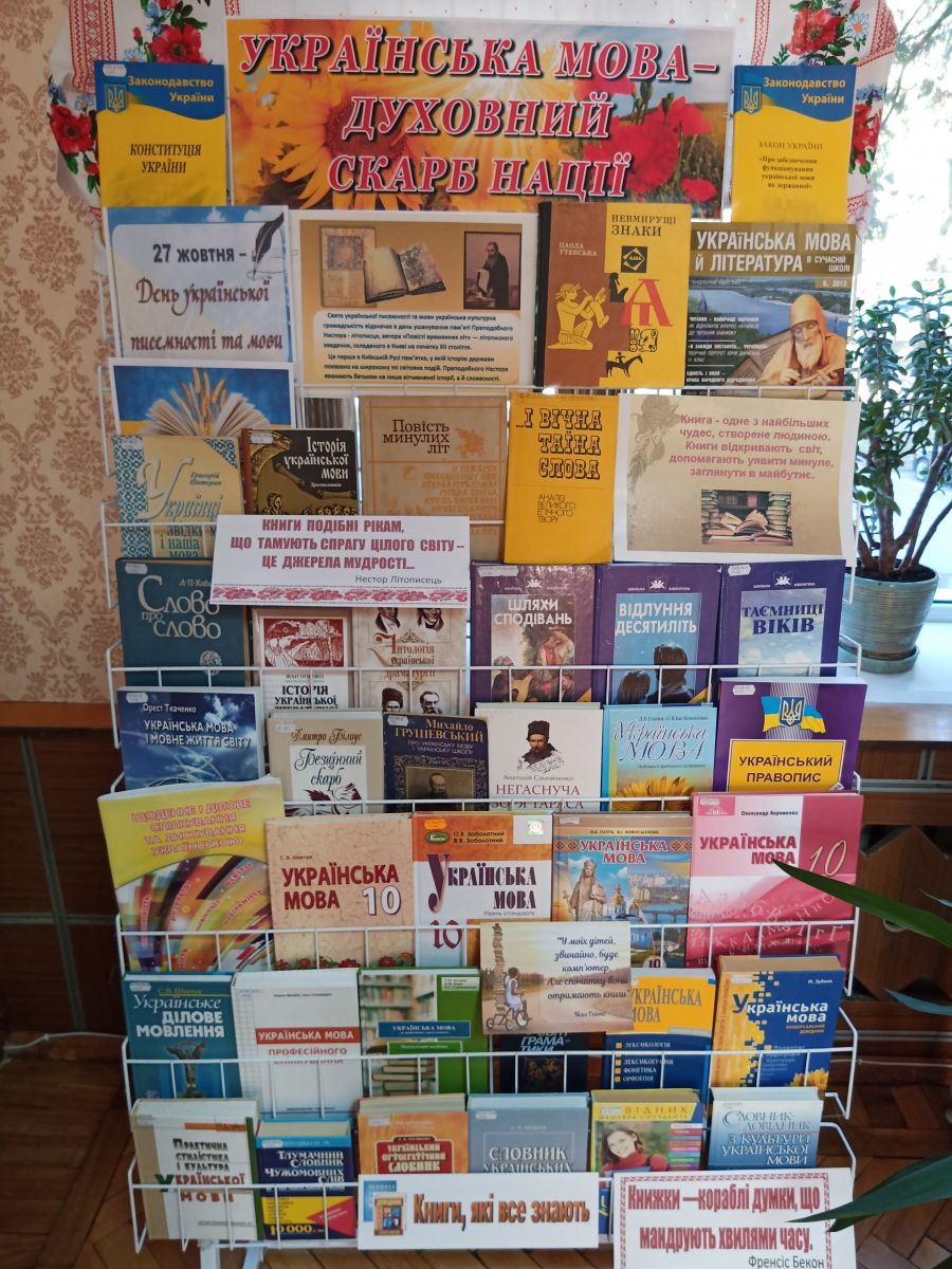 Велику експозицію «Українська мова – духовний скарб нації» зібрали наші бібліотекарі в читальній залі. Мовознавчі довідники, словники, посібники, збірки афоризмів, крилатих висловів та віршів про мову. Кожне з видань стане в пригоді тим, хто плекає рідне слово та дбає про чистоту української мови.