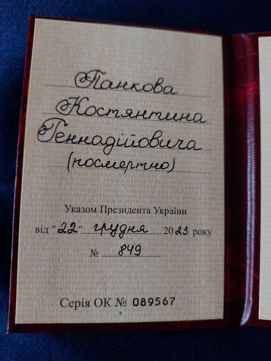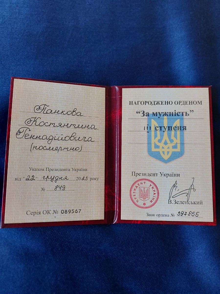 Орден “За мужність” ІІІ ступеня передали родині нашого випускника Костянтина Панкова. Він загинув 31 січня 2023 року під час виконання бойового завдання на Сході України.