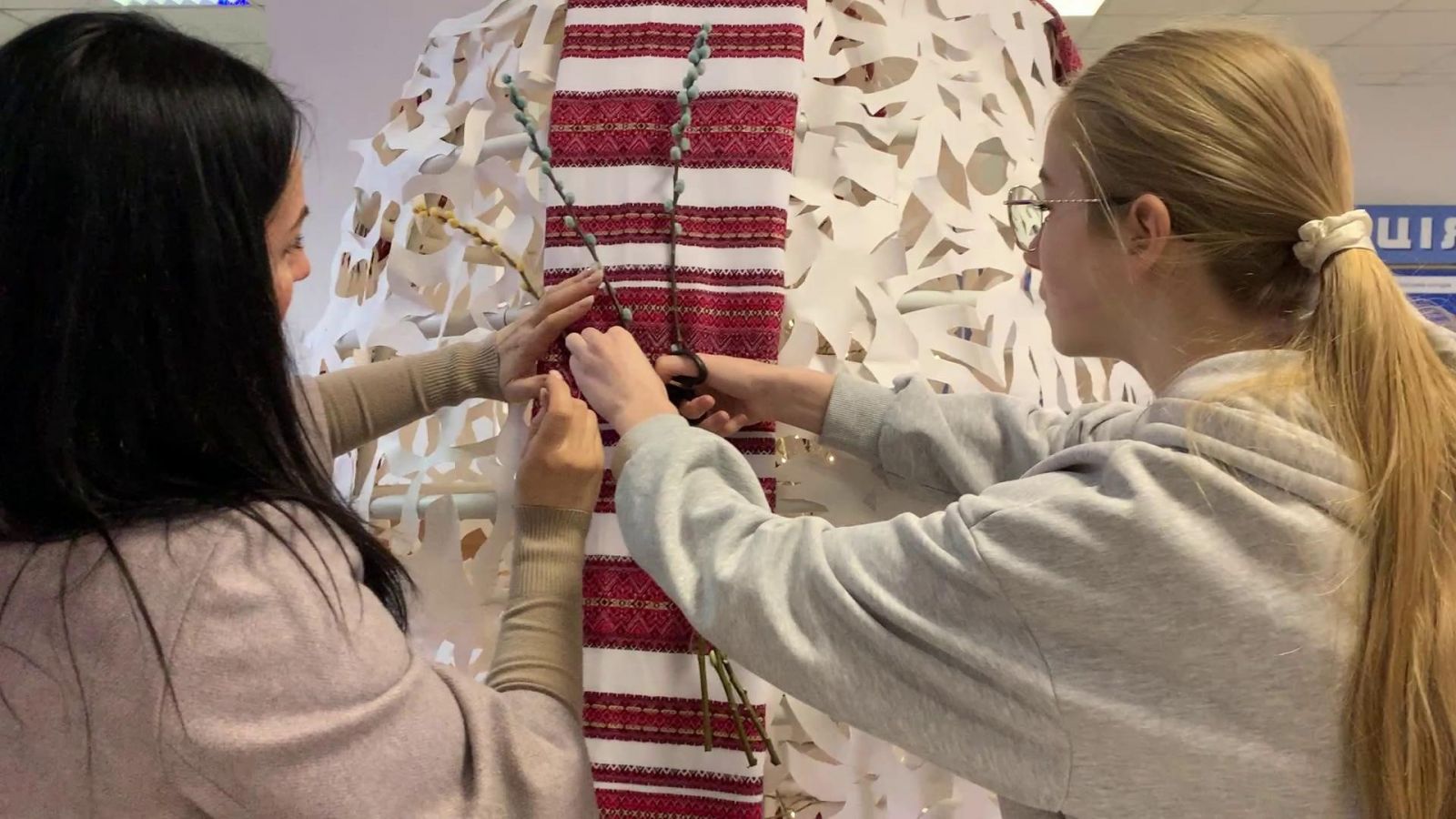 В результаті - в холі коледжу з'явилось двометрове яйце-витинанка! Понад сорок паперових полотен з візерунками виготовили студенти під час майстер класів. Великоднього символізму та української традиційності декору додали вишивані рушники і гілочки верби.
